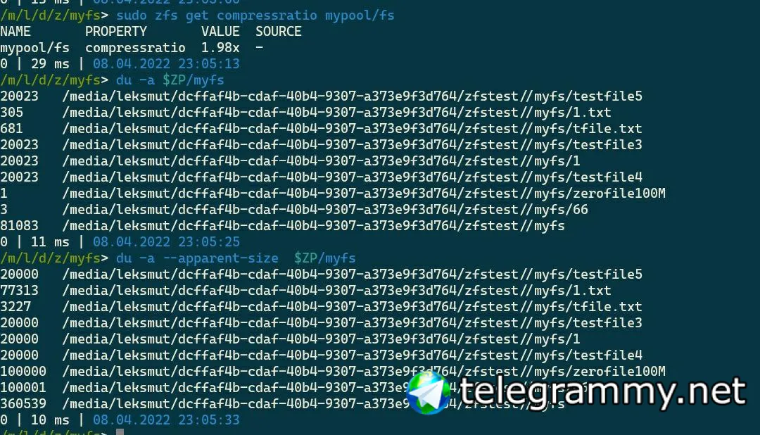 Ещё интересное наблюдение для новичков в коэффициенте сжатия не учитываются файлы с нулями. Они сохраняются разреженными и это не считается сжатием. В этом примере коэффициент сжатия х2 по факту намного больше, почти х5 т.к. 100мб нулей и файл 66 из нулей с допиской пары символов фактически места не занимают.