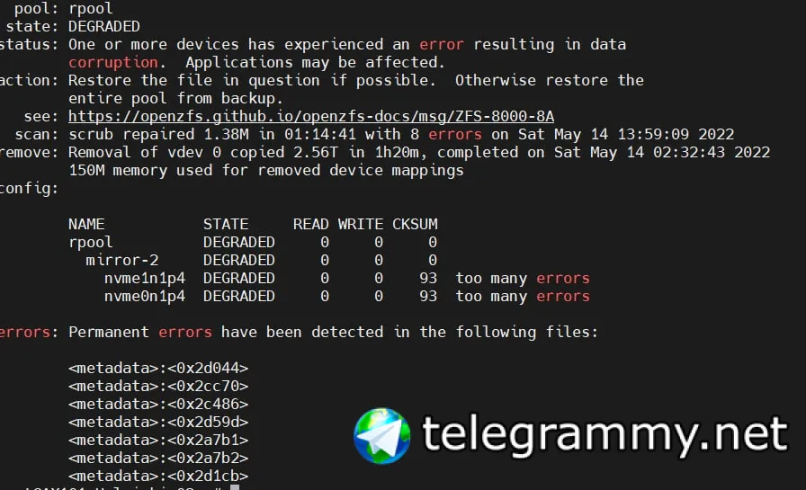 Добрый выходной день всем. У меня некоторая проблема =) Попробую описать максимально подробно. Имею кластер Proxmox на zfs. Возникла необходимость освободить место под swap раздел. Нужно было уменьшить зеркало zfs. На серверах установлено 2 SSD диска. Они в mirror-0 . для того что бы выкроить место для swap, уменьшил разделы zfs, действовал так: https://docs.google.com/document/d/16UvqRHTbEEJ_QUkFxA5oS73su2xiicZnvYuL-2W9i3k/edit?usp=sharing