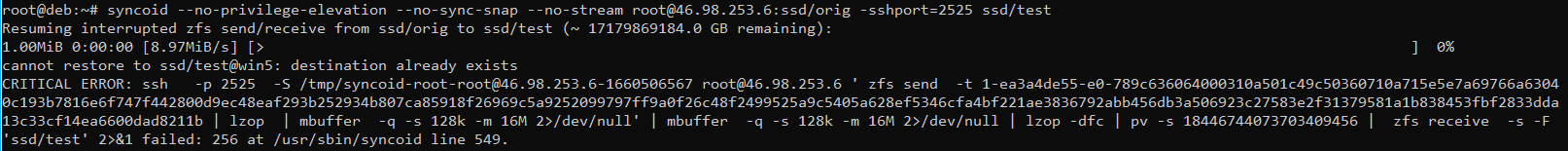 А если diff сравнивать то может и зфс лучше. Но конкретно тут я нуб, вообще я повторно пытался стнкнуть и мне пишет что данные на той стороне уже есть.