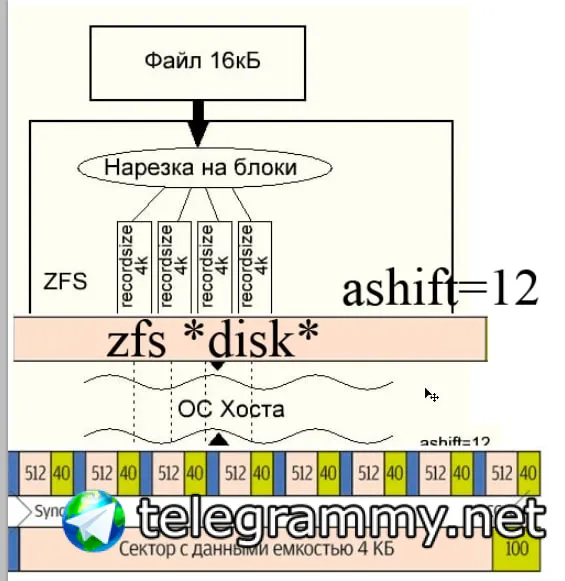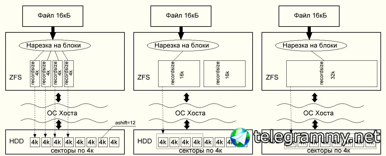 1. recordsize - настраиваемый размер блока. Если у нас записываемый файл 16к, recordsize 4к, то ZFS "нарежет" файл на 4 блока по 4к, и передаст ОС Хоста запрос на 4 операции записи.
