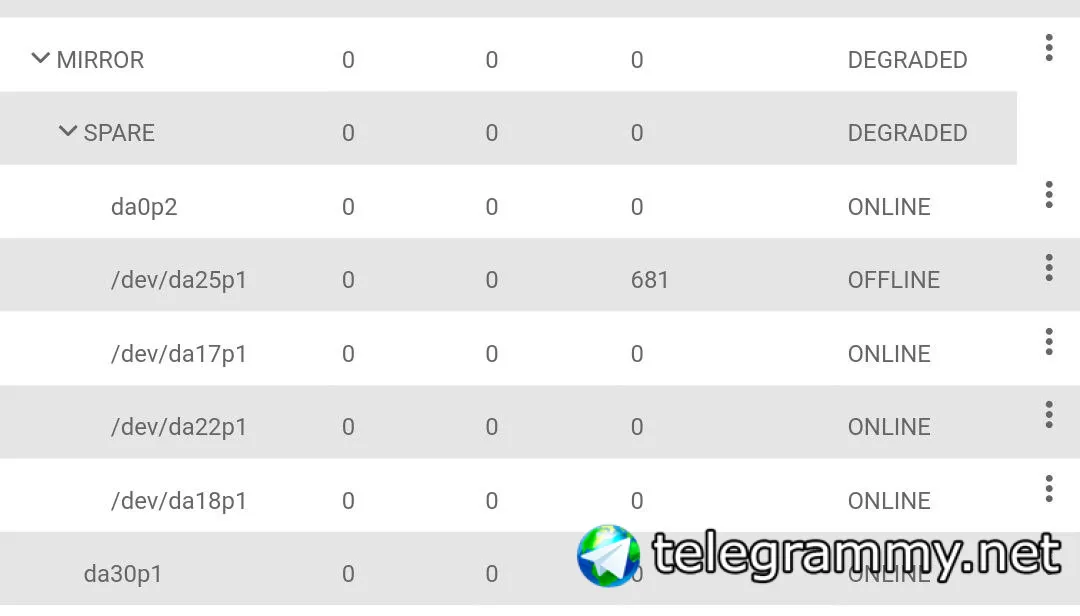 После resilvering ничего не поменялось и da25p1 продолжил висеть со статусом Degraded