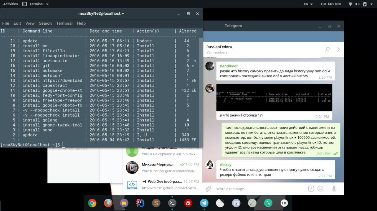 там последовательность всех твоих действий с пакетами, и ты можешь по ним бегать, откатывать изменения которые внес в компьютер, вот был у меня playonlinux + 100500 зависимостей, вводишь команду, ищешь транзакцию с playonlinux ID, потом ундо и ID, оно все изменения откатывает назад тобишь удаляет все пакеты которые шли в комплекте