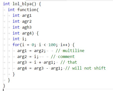 да и аргументы на самом деле пиздецово смотрятся. Скобка в одном месте открыта, аргументы левее. У меня такой проблемы нет изза комбинации таба и пробела. Ширина меняется но вырвнивание не ломается