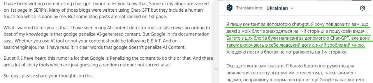 Хочу сказати, що це мабуть одна з найбільш правильних у цьому плані стратегій. Тому що, не зважаючи на всі хвалебні епітети контенту від ChatGPT (по інформаційній цінності) ще дуже далеко до людського. Тому «людський дотик» дуже бажаний.