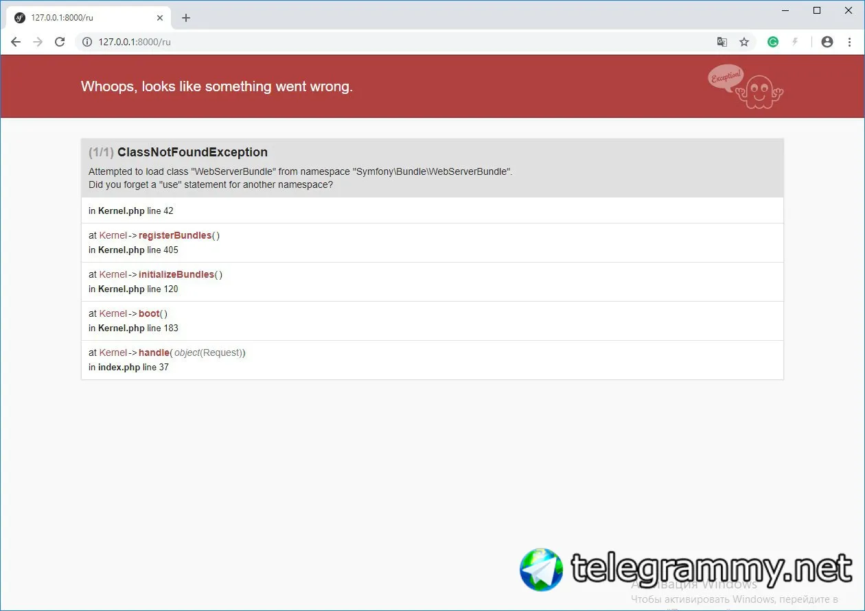 сайт не работает, но выскакивает другой ексепшн, уже с другим бандлом
