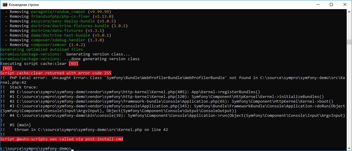 пытаюсь сделать продакшн из демки. После composer install --no-dev --optimize-autoloader все рушится. Attempted to load class "пакет". Пробывал удалять их появляются другие ошибки. Сейчас решил бросить эту затею ганяться за ошибками и поставил easycorp/easy-deploy-bundle. Вот только запустить ее не могу. Пишу php bin/console deploy выдает Command "deploy" is not defined.