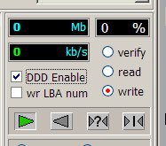 Режим записи: DDD Enable (усиленное, трёхкратное стирание поверхности), wr LBA num (запись в сектор его адреса) Мы выбираем DDD Enable - это повысит качество стирания диска, иногда в этом режиме удаётся стереть даже плохие сектора диска.