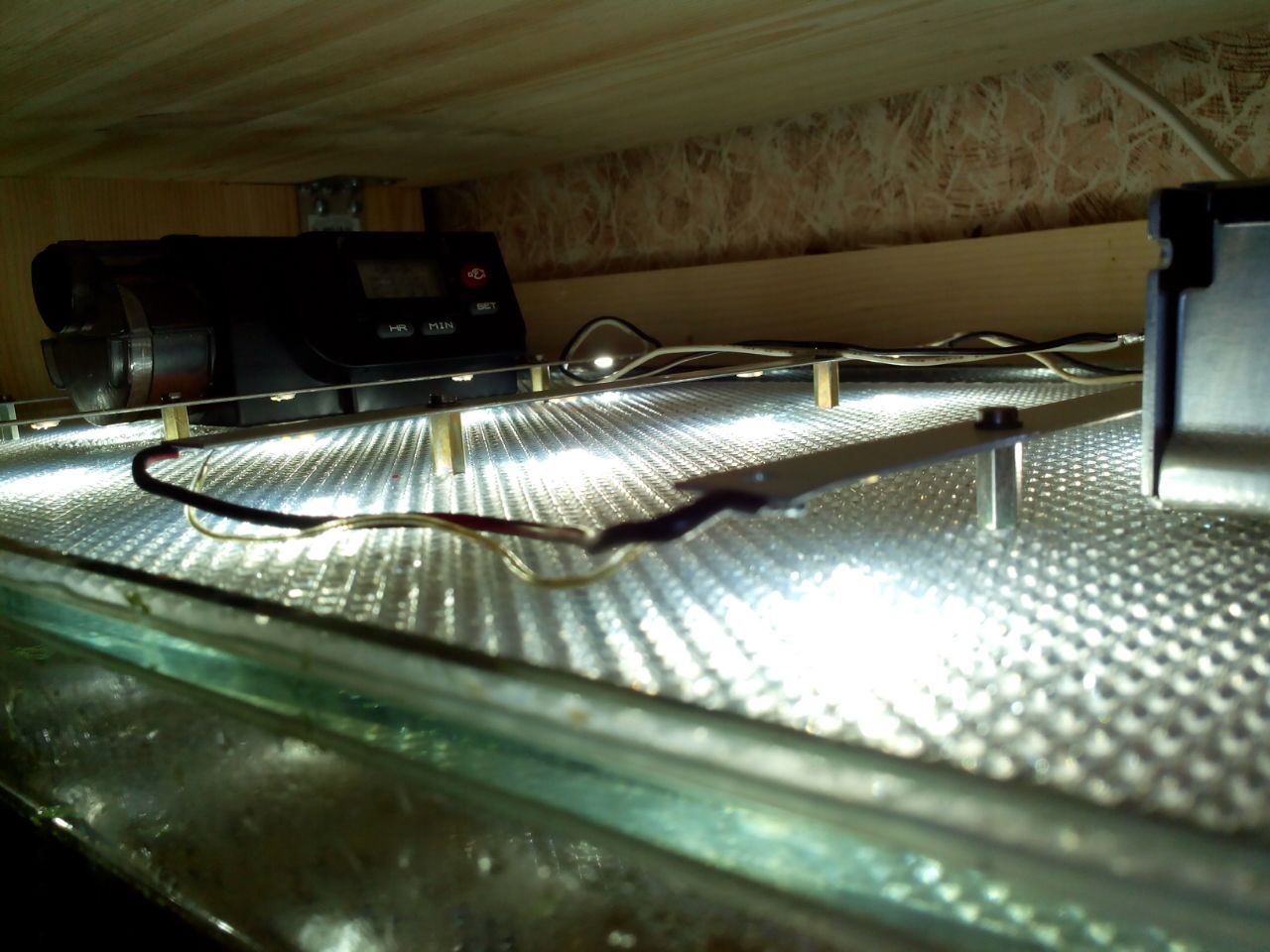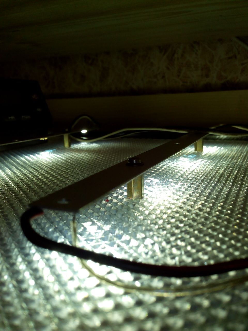 На работе выпросил у главного энергетика сломаный светодиодный светильник от подвесных потолков. Там диоды сидят не на ленте, а на алюминиевых полосках по 4 диода трёхвольтовых. Очень удобно крепить на стоечки ))