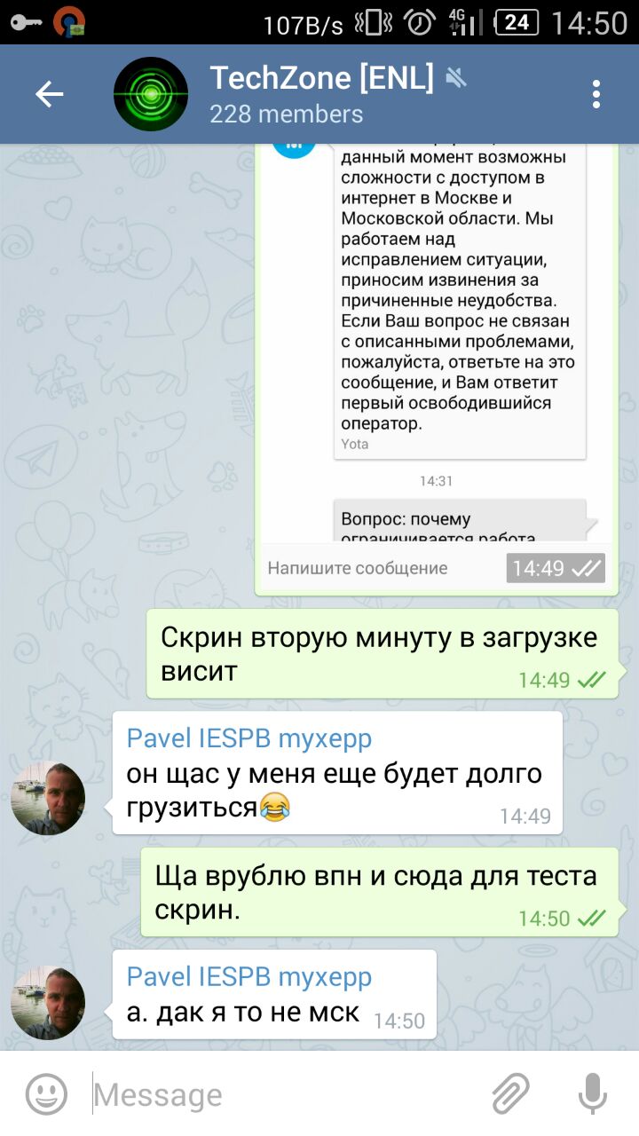 А сегодня опять долго картинки прогружались.... И меня дернуло проверить - вышел в инет через VPN . опять мгновенно грузится. Вывод: Йота режет траффик тлгрм. Да они совсем охуели !