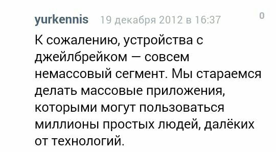 Им предложили чтоб у этого меньшинства, которой пользуется джейлом, была функциональность, как на андроиде, ведь такие девайсы вполне позволяют. То есть "чистым" пользователям ничего бы не поменялось, а это меньшинство получило бы небольшую плюшку. Но яндексу ломак