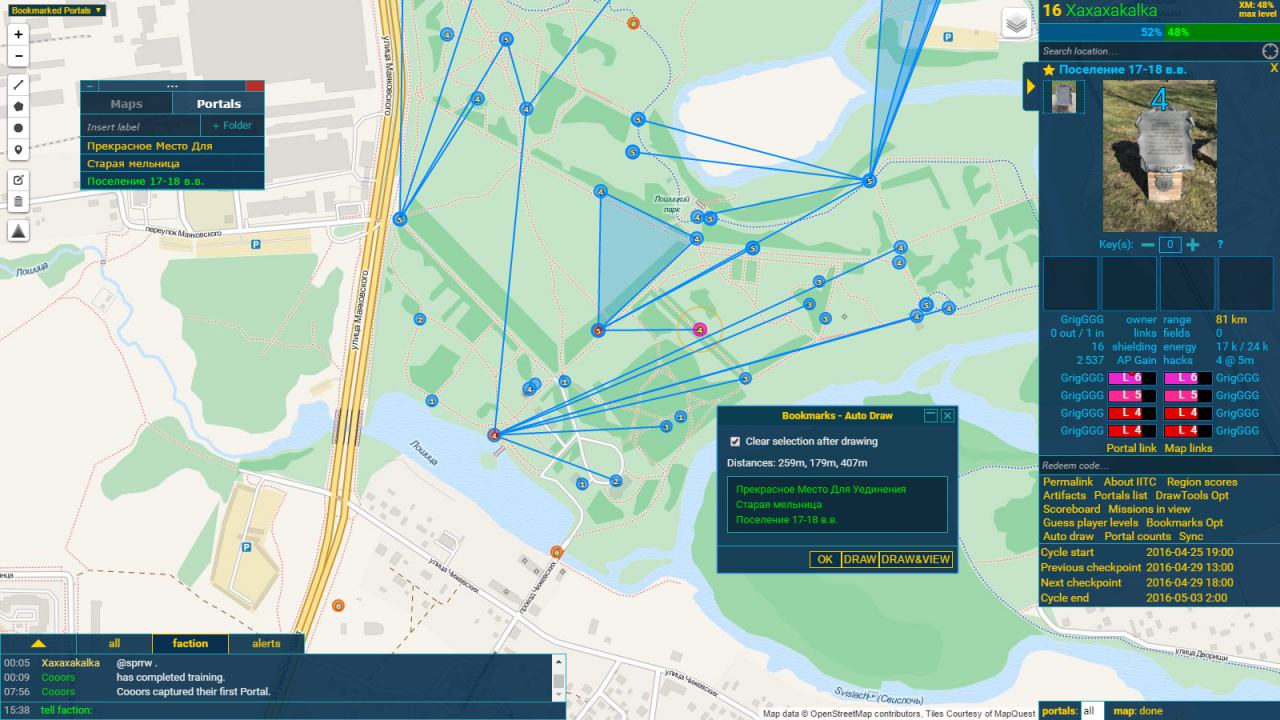 берешь iitc + drawtools + bookmarks, добавляешь 2 портала в букмарки (надо нажать звездочку на портале), потом нажимаешь autodraw под описанием портала, выделяешь в списке эти 2 нужных и смотришь расстояние между ними. Картинку сделать?
