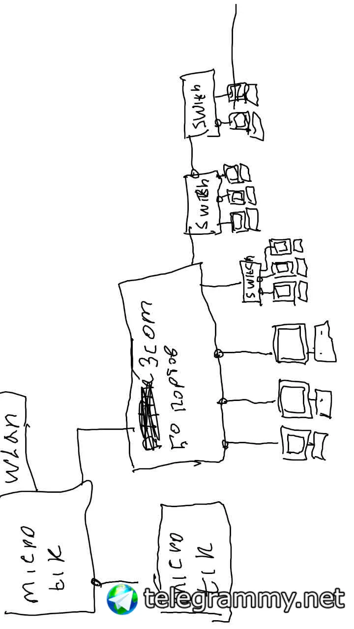 Вот такая примерно сеть у меня сейчас. Не прям один в один, но вложенность свичей примерно такая. Микротики раздают вайфай в разных концах офиса