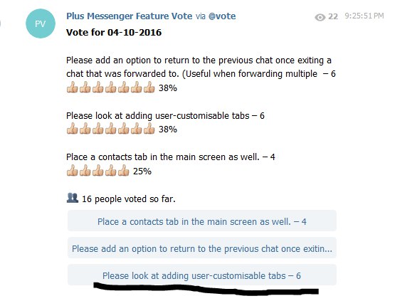 We have just created a channel to vote on new features at @plusmsgrfeatures. You can vote on the most interesting feature posted that day every evening around 18:00 GMT every day!