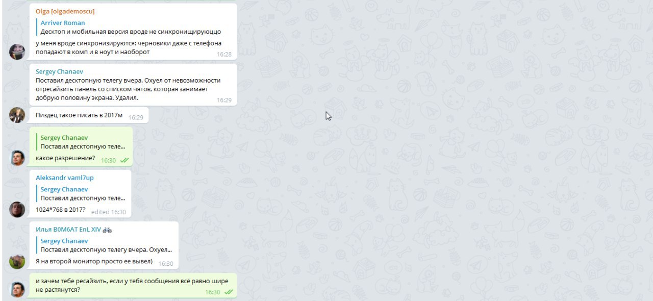 Поставил десктопную телегу вчера. Охуел от невозможности отресайзить панель со списком чятов, которая занимает добрую половину экрана. Удалил.