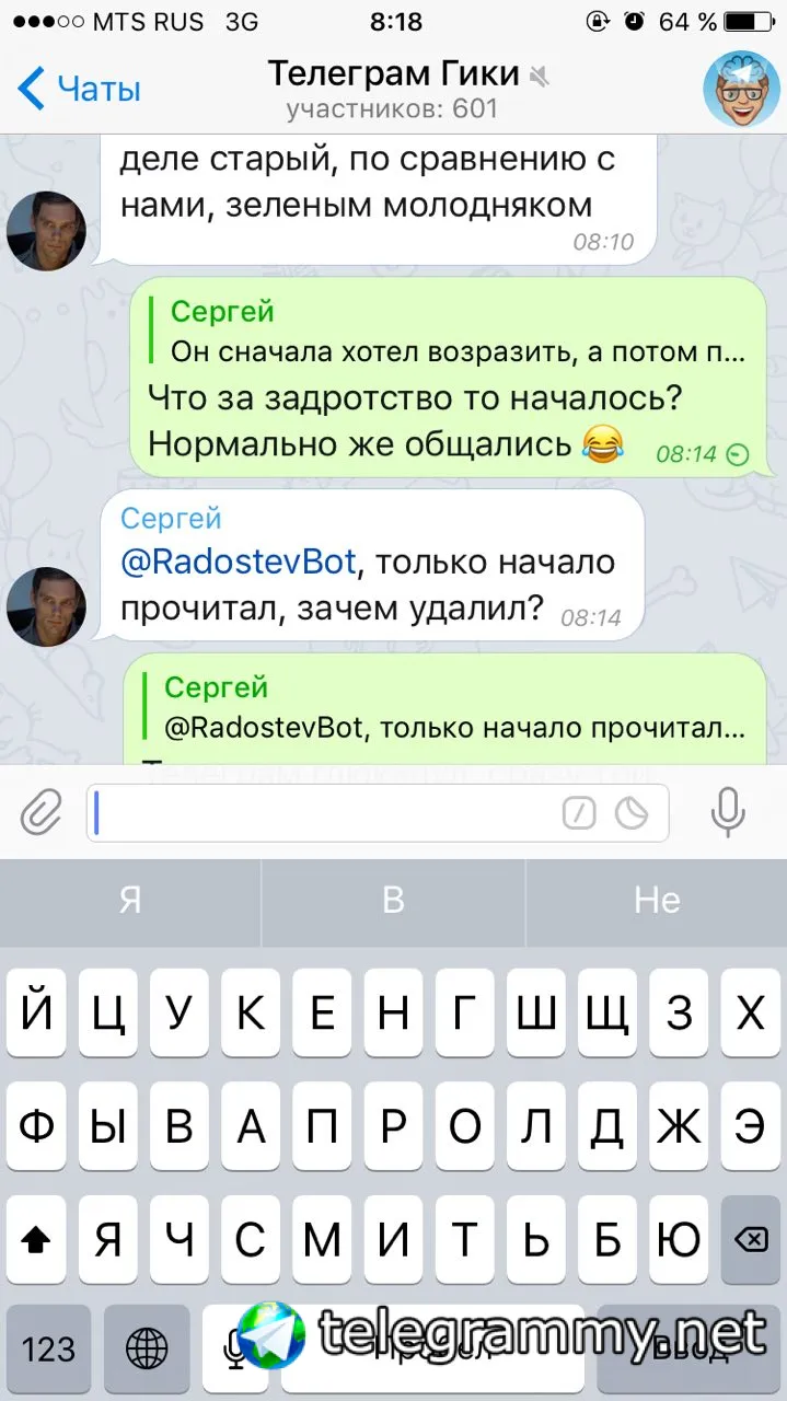 Телеграм глюканул, сразу три сообщения пришло в чат, хотел одно удалить, все удалились