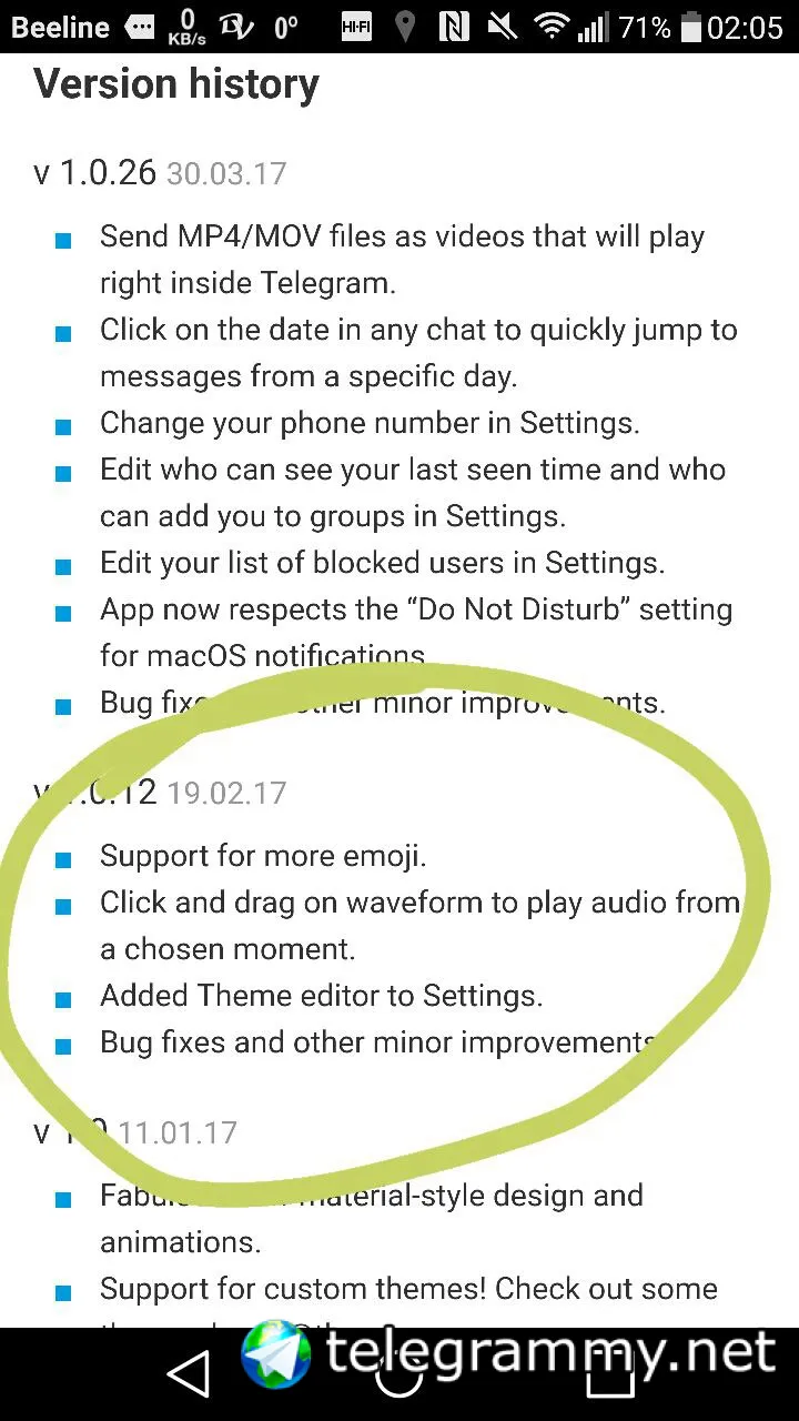Сами пройдите по ссылке и посмотрите, там написано 1.0.12 поддержка смайлов, перемотка аудио сообщений etc