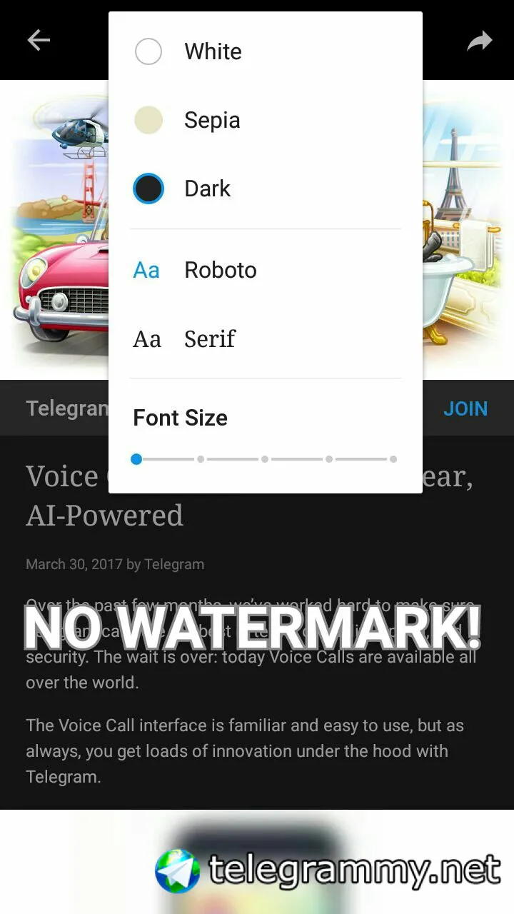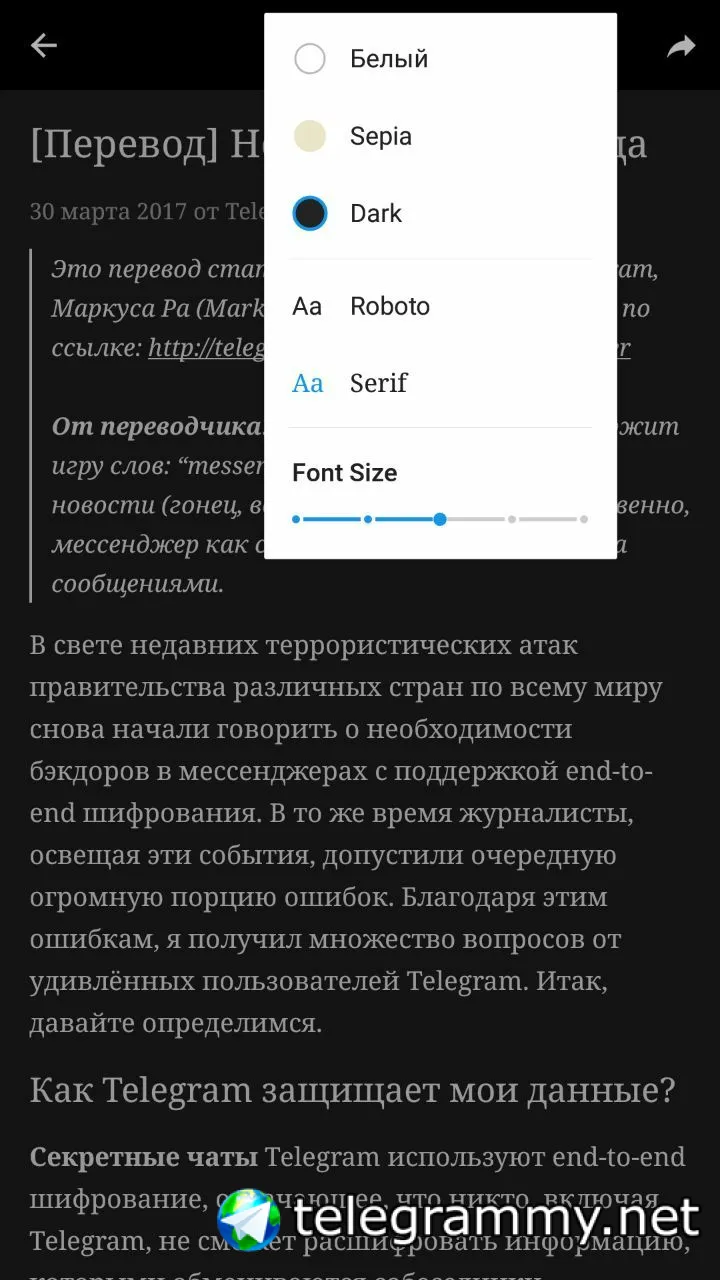 В следующих версиях Telegram появится возможность настраивать внешний вид Instant View. Выделять текст по-прежнему нельзя :(