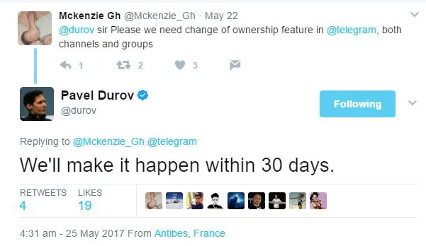 По словам Павла Дурова, в течение 30 дней появится возможность передавать право владения на группы и каналы.