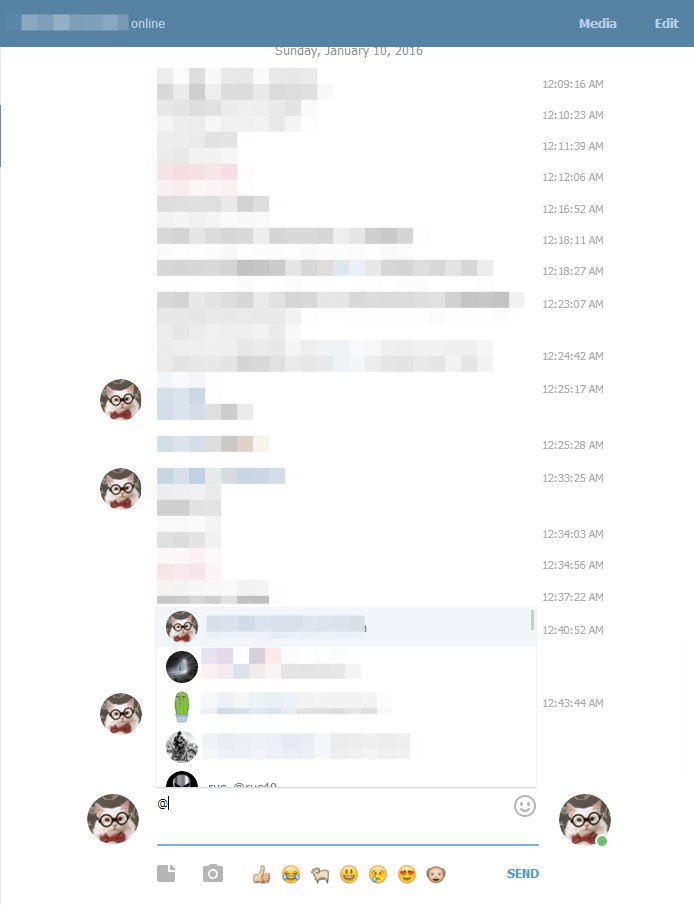 Странный глюк словил в Web-версии. В чате с самим с собой при вводе @ подставил ники из этог очата