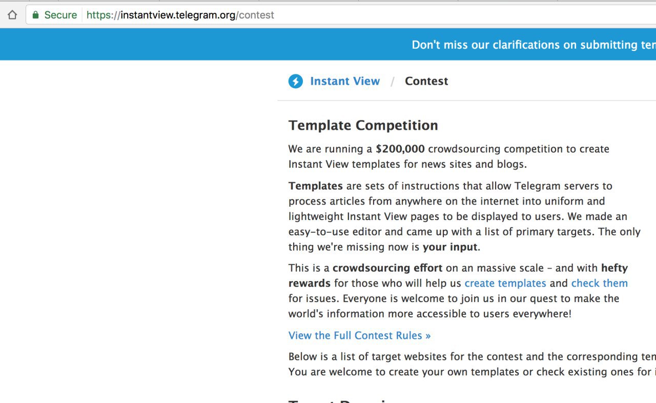 В список сайтов для конкурса Telegram по Instant View добавлены ещё приблизительно 1400 веб-сайтов; таким образом, их общее количество достигло около 3000 (трёх тысяч). Призовой фонд, соответственно, тоже увеличился до 315 тысяч долларов.