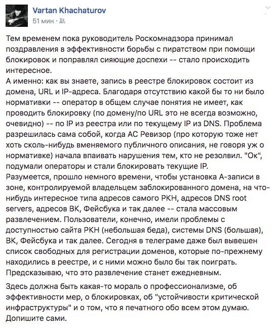 При этом РКНу все говорили много раз и много лет, что в их системе блокировок есть такая дыра и проблема, но РКНу же виднее, они там больно умные.