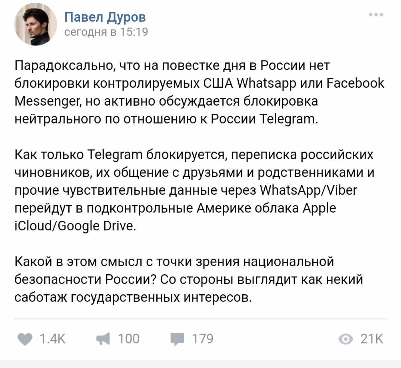Мнение Павла Дурова по поводу сегодняшних событий.