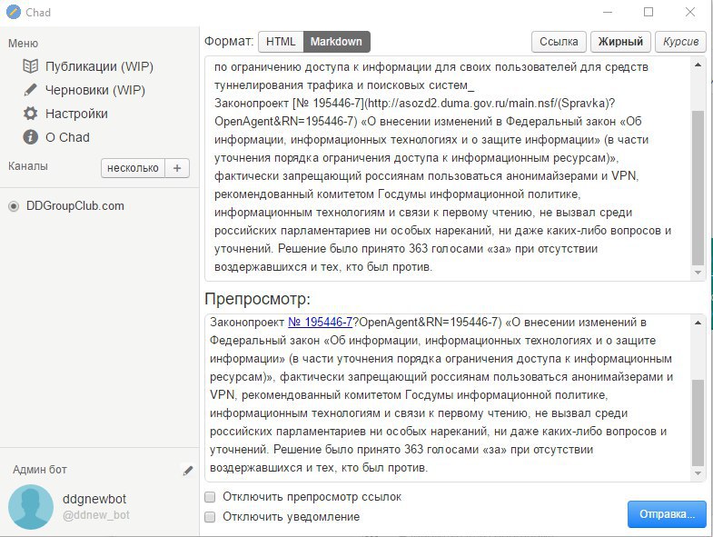 вообще без разметки тоже не отправляет ничего. Странно в канале бот также админ, токен верный..