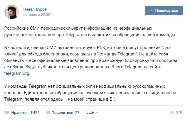 Павел Дуров прокомментировал некорректные заявления журналистов о способе обхода блокировки Telegram «в два клика».