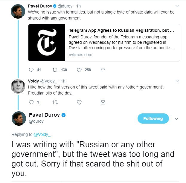 Оговорочка по Бортникову: Дуров переписал твит, исправив формулировку «не будем передавать данные никаким другим властям» на «не будем передавать данные никаким властям»