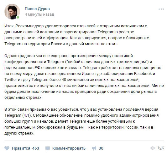 Павел Дуров призывает всех пользователей установить Telegram 4.1, в котором есть поддержка работы через сторонние прокси-серверы.