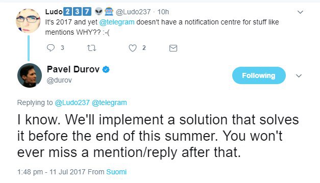 По словам Павла Дурова, к концу этого появится отдельная «секция» (или что-то в этом роде, подробностей нет), в которой можно будет увидеть ответы на свои сообщения и упоминания себя в чатах.