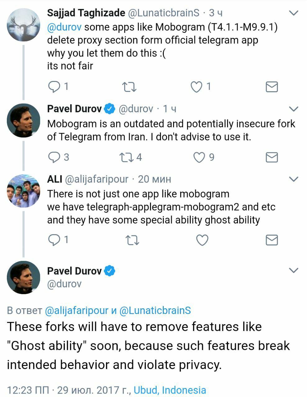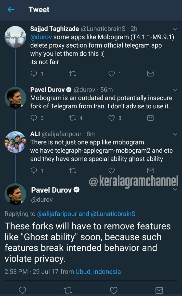 Павел Дуров раскритиковал Mobogram (альтернативный клиент Telegram из Ирана) и сообщил, что таким приложениям придётся убрать небезопасные функции типа «невидимки», чтобы продолжать работать.