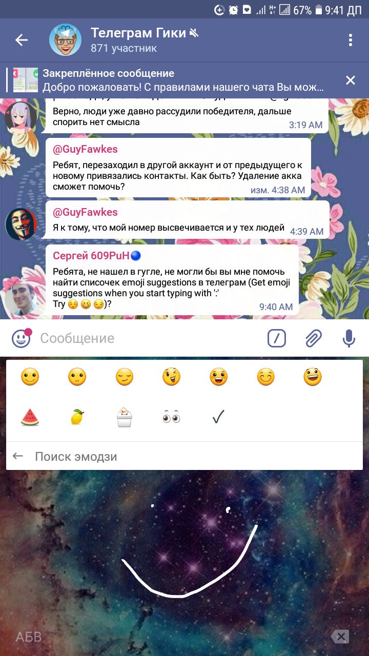 Ребята, не нашел в гугле, не могли бы вы мне помочь найти списочек emoji suggestions в телеграм (Get emoji suggestions when you start typing with ':'