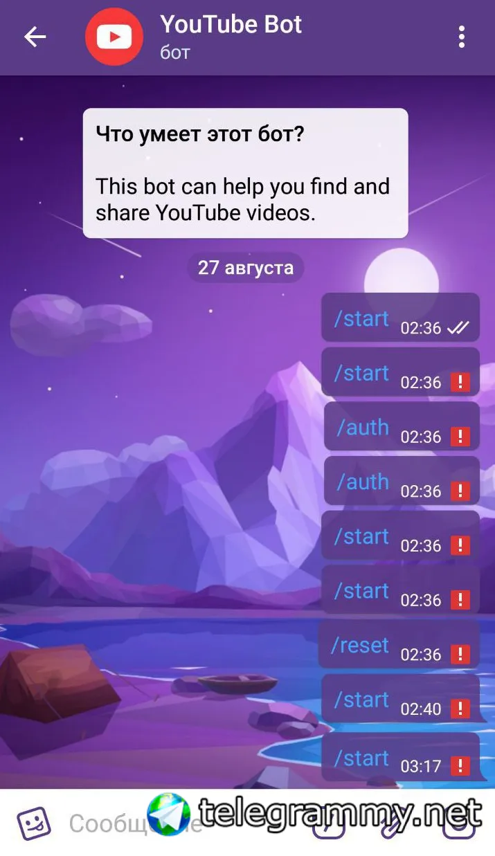 Если по какой-то причине вы не можете отправить сообщение боту (горит восклицательный знак), просто заблокируйте его и тут же разблокируйте, это решит проблему.