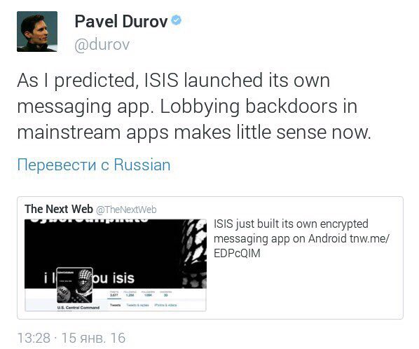 — «Как я и предсказывал, Игил выпустил своё собственное приложение по обмену сообщениями. Закулисное лоббирование в основных мессенджерах имеет мало смысла сейчас»