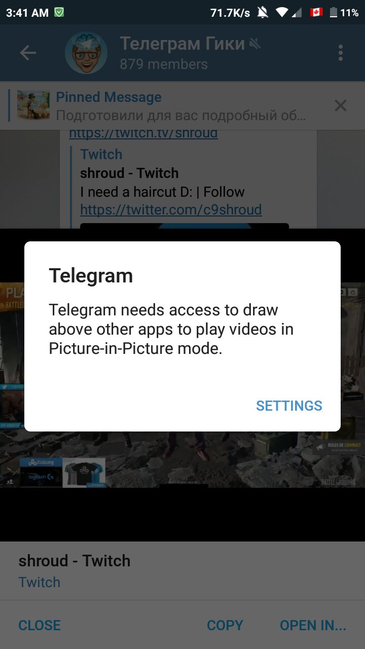 На будущее, нужно зайти в настройки --> установленные программы --> Телеграмм --> Other permissions и дать доступ "Display pop-up window "