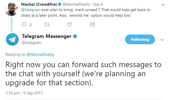 В будущем сохранение информации в чате с самим собой (эдакая «записная книжка») станет удобнее.