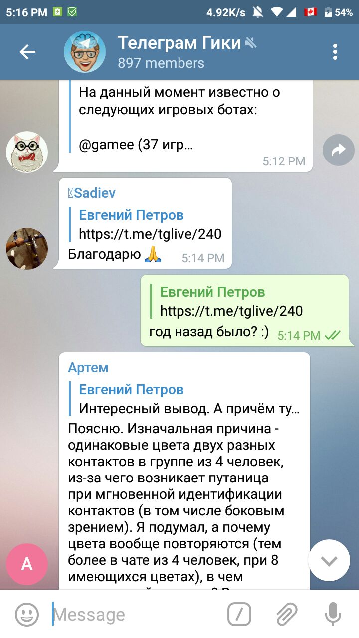 Поясню. Изначальная причина - одинаковые цвета двух разных контактов в группе из 4 человек, из-за чего возникает путаница при мгновенной идентификации контактов (в том числе боковым зрением). Я подумал, а почему цвета вообще повторяются (тем более в чате из 4 человек, при 8 имеющихся цветах), в чем смысл такой задумки? Вполне очевидно, что нельзя сделать 20000 разных оттенков которые бы легко отличались невооруженным глазом.