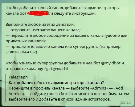 бот в канале, админ, может все, в лс боту юзернейм канала отправлен..