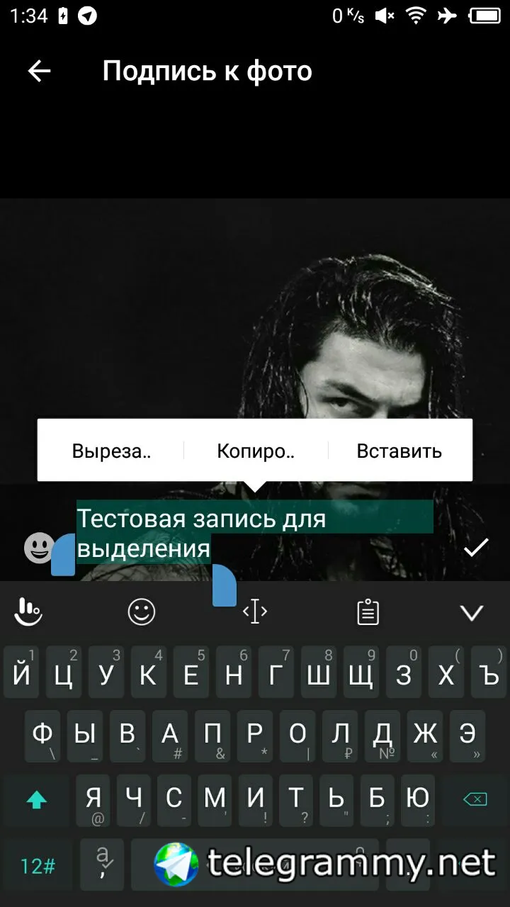 Ну попробуй добавить подпись к фотографии при отправке. У меня не получается выделить больше одного слова, чтобы вызвать контекстное меню для всего блока
