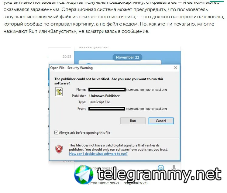 Возможно, но маловероятно. Дело в том, что, во-первых, для того, чтобы запустить зловреда, его нужно явным образом скачать (к слову, в TDesktop в некоторых случаях скачанные файлы запускаются автоматически), а загружать что-то с неизвестных источников, как известно, не самая лучшая идея. Специалисты "Лаборатории Касперского" пишут, что злоумышленники подсовывали файлы под видом изображений (см. скриншот), но при этом Telegram Desktop отображает файл не как "изображение, отправленное файлом", а просто "файл", и к тому же сама операционная система предлагает открыть скрипт вместо картинки. Скорее всего, идёт расчёт на невнимательного пользователя.