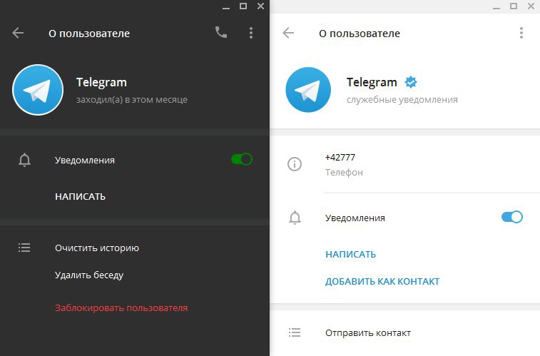 Справа - настоящий аккаунт Telegram.