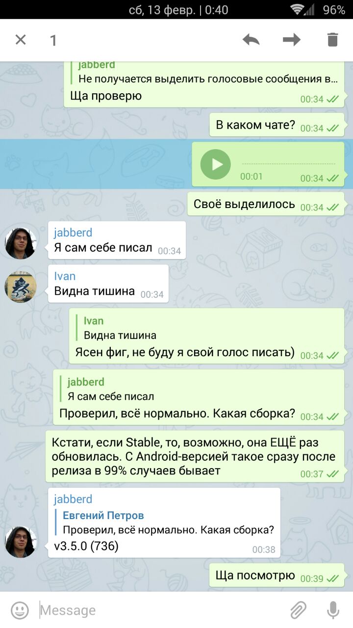 Не получается выделить голосовые сообщения в Telegram на Android, чтобы, например, удалить их. Так всегда было?