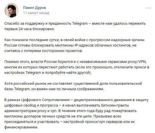 Дуров поблагодарил всех за поддержку и пообещал миллионы долларов создателям прокси и VPN. 16 миллионов IP заблокированы, Telegram работает.