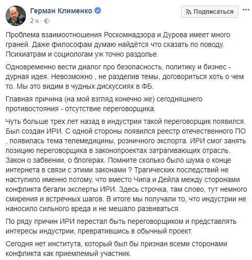 Советник Президента Герман Клименко стал философом. Но тон уже меняется. НЕ «у них там террористы сидят» и «Дуров, верни ключи», а «давайте что ли найдём переговорщика, которому будут доверять все»