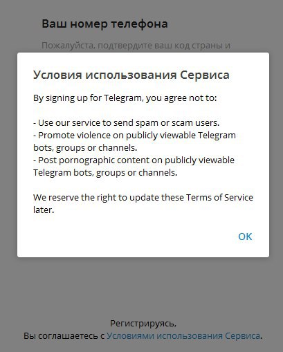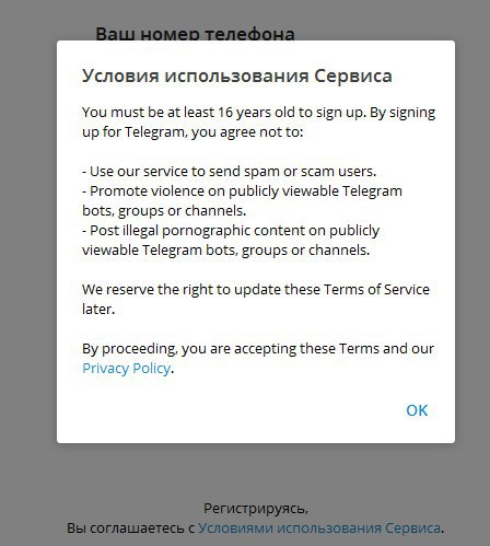 Окно с условиями использования сервиса в TDesktop 1.2.25 и выше. Приписка про "старше 16 лет" и ссылка на Privacy Policy отображается, если выбрать в списке европейскую страну (слева)