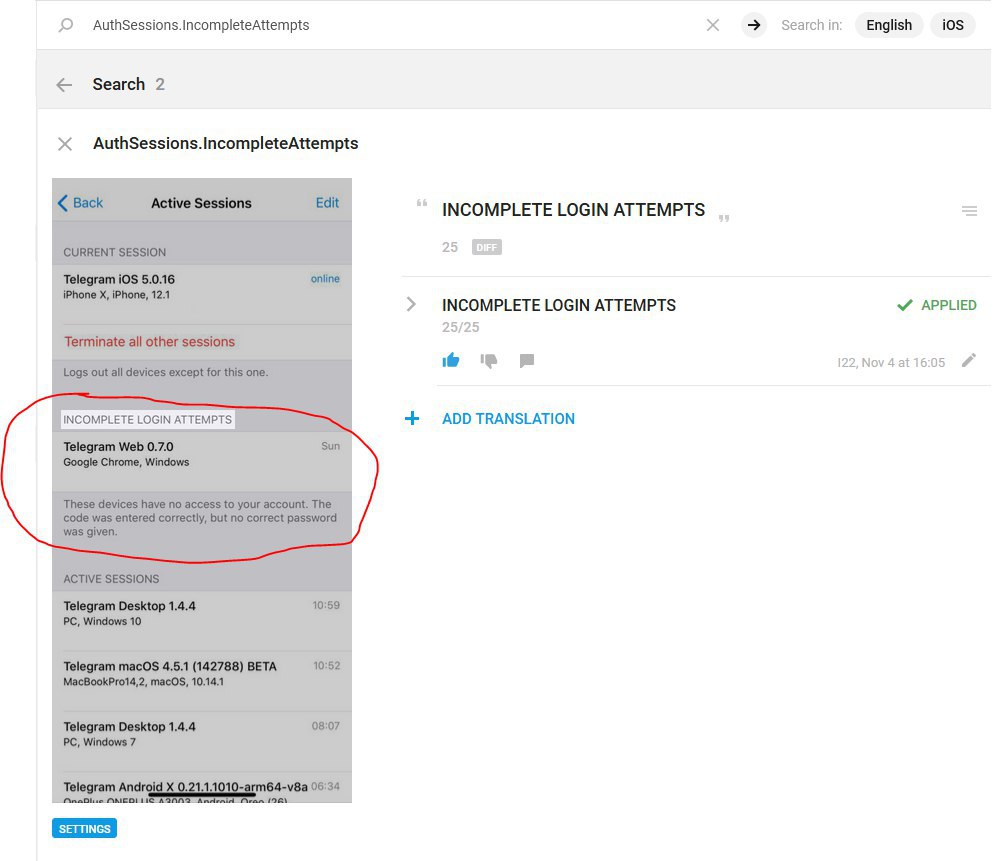 Согласно новым строкам в облачной локализации для #iOS, в разделе активных сессий в будущем появится отдельная секция с информацией о незавершённых входах, когда был введён правильный код (из другой сессии или SMS), но неверный пароль двухэтапной авторизации.