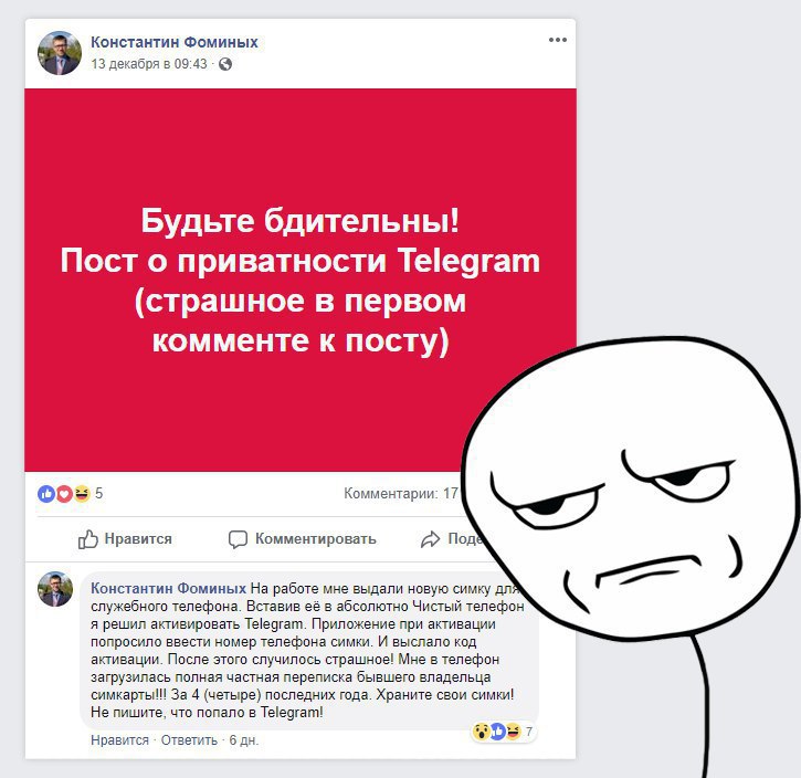 Житель Перми Константин Фоминых рассказал на своей странице Facebook о том, что после авторизации в Telegram на новую выданную на работе сим-карту «Билайна», он получил полный доступ к аккаунту в мессенджере предыдущего владельца.