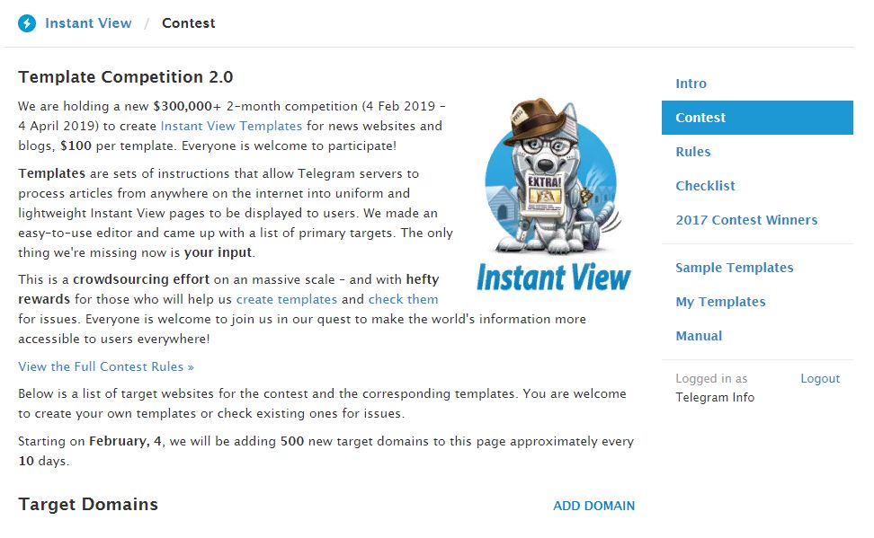 На сайте конкурса шаблонов Instant View появилась возможность добавления своих доменов для дальнейшей настройки (кнопка «ADD DOMAIN»).