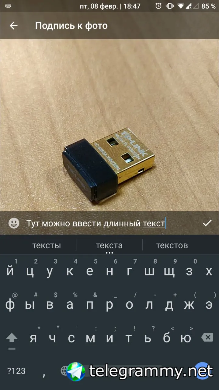 Вставляйте картинку и делайте к ней подпись (до 1024 символов). Можно уже после отправки подпись добавить к изображению.